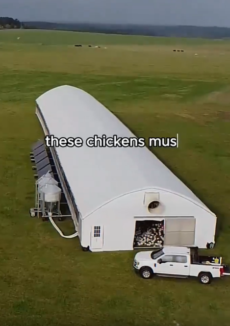 이동식 닭장인데 바닦면은 뚤려있어서 머무를때는 닭들이 초원의 실제 바닦면에 있는 벌래를 직접 잡아먹고 배설을 하게되고