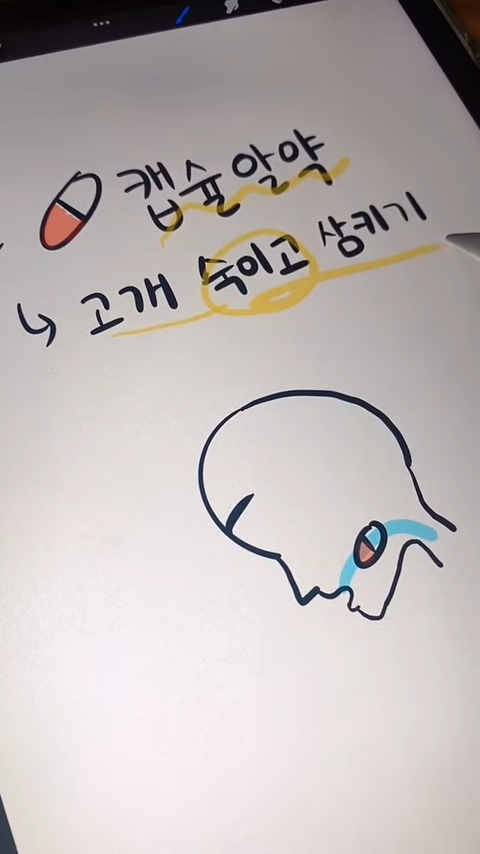 알약을 먹을 때는 고개를 들고, 캡슐을 삼킬때는 고개를 숙이고 먹으면 도움이 됨!!