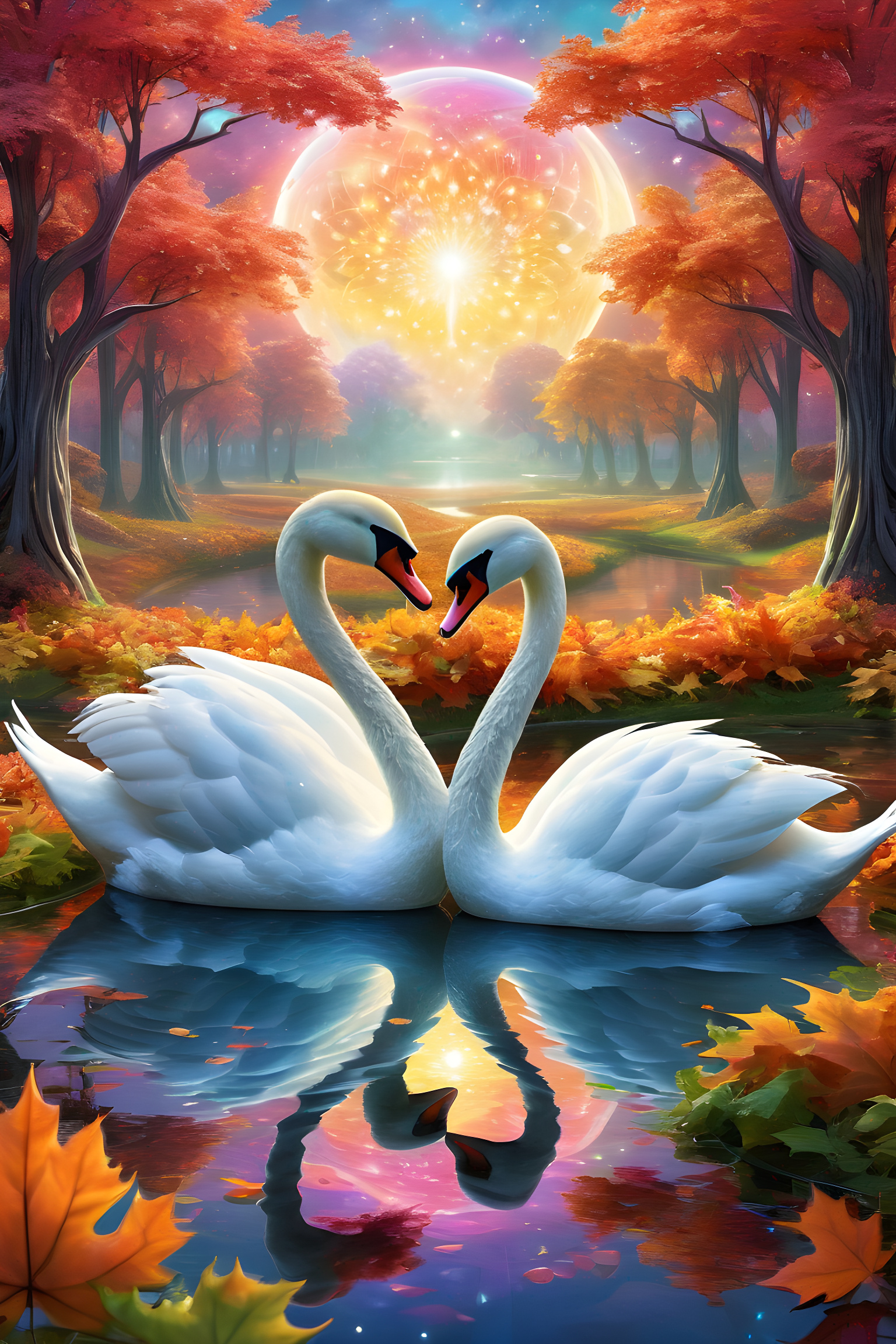 two_swans_in_a_pond_with_trees_and_a_bright_sun.jpg