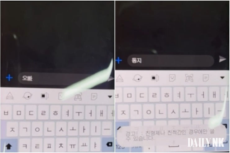 데일리NK가 최근 입수한 북한 스마트폰의 통보문(메시지) 애플리케이션(앱)을 분석한 결과 메시지창에 ‘오빠’라고 입력하면 자동으로 ‘동지’로 변환됐고, 동시에 “경고! : 친형제나 친척 간인 경우에만 쓸 수 있습니다”라는 알림창이 나타났다.