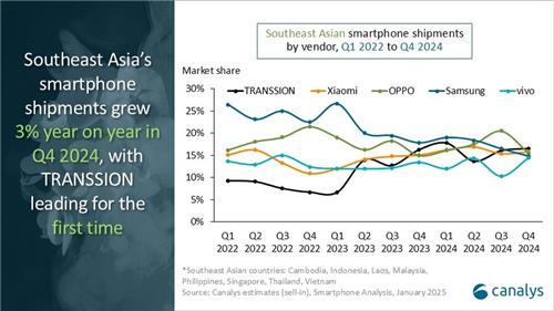 시장조사업체 카날리스는 작년 4분기 출하량 기준 동남아시아 스마트폰 시장 점유율에서 트랜션이 17%로 첫 1위를 차지했고 오포와 샤오미가 각각 16%로 뒤를 이었다고 11일 밝혔다.