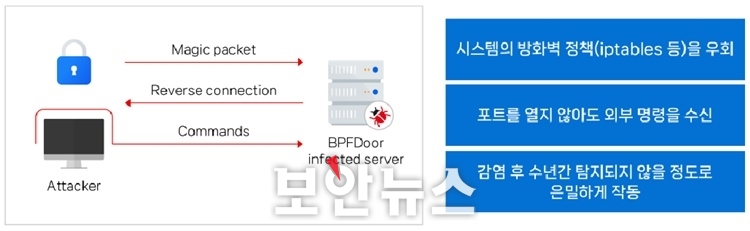 이 악성코드는 시스템 방화벽 정책을 우회하고, 포트를 열지 않아도 외부 명령을 수신할 수 있다. 감염 후 수년간 탐지되지 않을 정도로 은밀하게 작동하는데, 시스템 내 특정 트래픽을 선별 수신해 ‘매직 패킷’으로 불리는 명령어로 악성코드를 활성화하고 데이터 유출을 시도한다.
