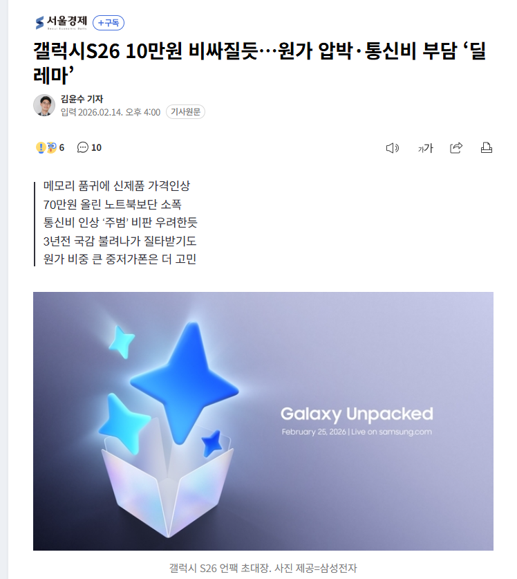 갤럭시S26 10만원 비싸질듯