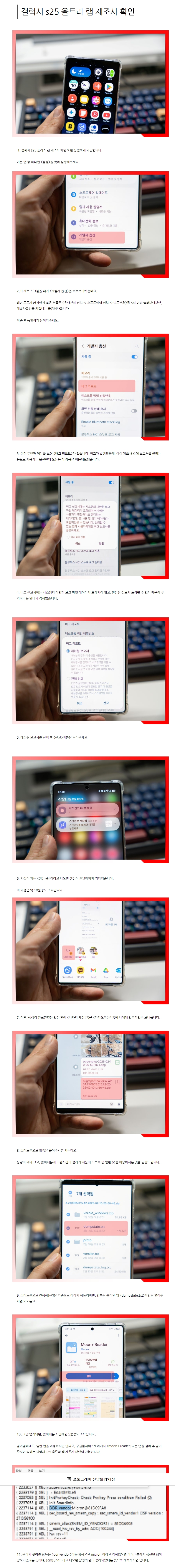 갤럭시 S25 시리즈의 램 제조사를 확인하려면 다음과 같은 방법을 시도해 볼 수 있습니다: