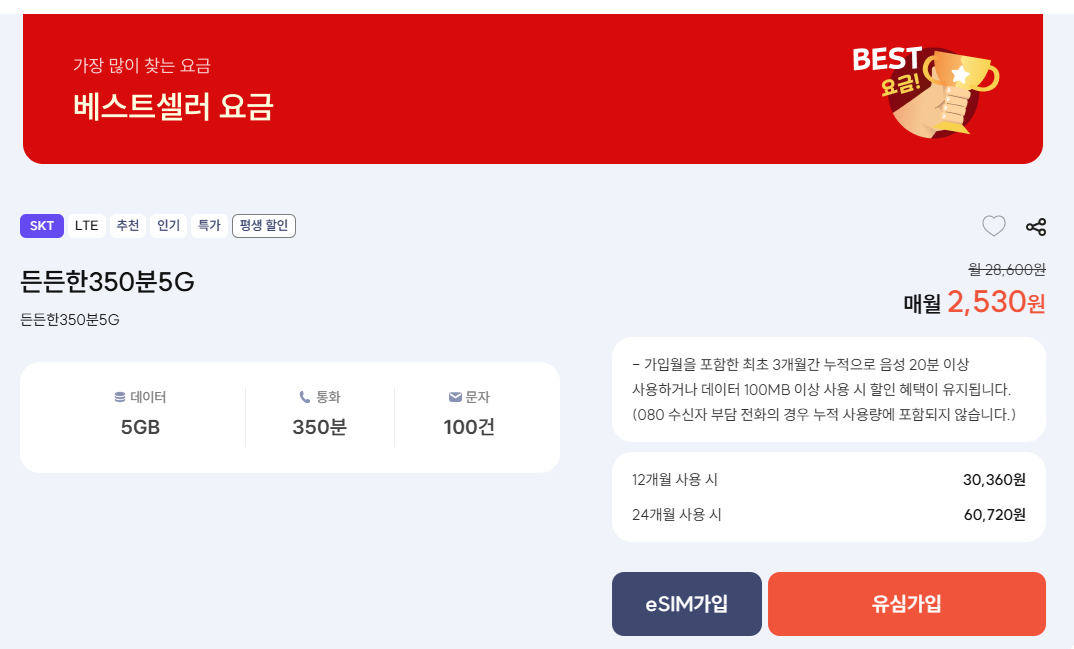 5G 350분 100문자 2530원